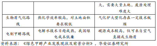 生物质甲醇主要有 2 种生产途径:生物质气化-合成气路线;生物质发酵-甲烷路线。生物质气化路线具备热化学效率较高、对土地面积要求低的优点,但同时面临原料适应性差、产气效率低、焦油难以处理、气化炉大型化较难等问题,制约了生物质制甲醇项目产业化发展,目前建成的商业化装置很少。生物质发酵-甲烷工艺过程的关键是高效稳定的厌氧发酵技术,其优点是自然发酵过程相对温和,耗能强度低,但同时面临厌氧发酵过程中附带的多种产物会影响甲醇的产量和质量,以及自然发酵过程缓慢、沼气规模化处理可行性低、对土地面积要求高等问题。电制甲醇工艺主要是可再生能源提供绿氢,碳源来自于空气直捕或生物质,二氧化碳加氢合成工艺十分成熟,主要难度来自于绿氢和碳源的获取。随着绿电成本的下降,绿氢成本有望持续走低,碳源获取技术或将成为该路线是否能够商业化成熟的关键因素。
