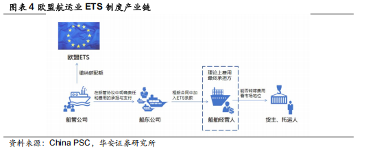 此外,欧盟也积极推动航运业绿色转型。从 2024 年 1 月起,航运业将被纳入欧盟碳排放交易体系(ETS),所有进入欧盟港口的 5000t 级以上的客运和货运船舶需监测和汇报碳排放量,并为其排放的每吨 CO2 当量缴纳一定的碳配额,需支付的排放量百分比从 40%(2024 年)、70%(2025 年)、100%(2026 年)逐年提升。另外,未来航运业被纳入到 ETS 的温室气体将不仅包括二氧化碳,甲烷和氮氧化物都将从 2026 年起被纳入 ETS 之中。