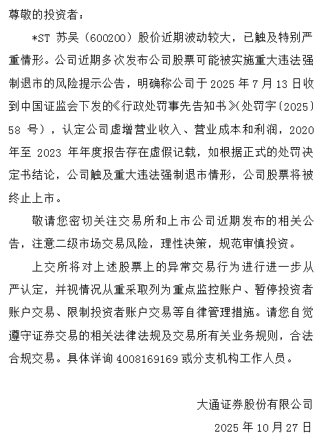【风险提示】关于*ST苏吴(600200)交易风险提示公告