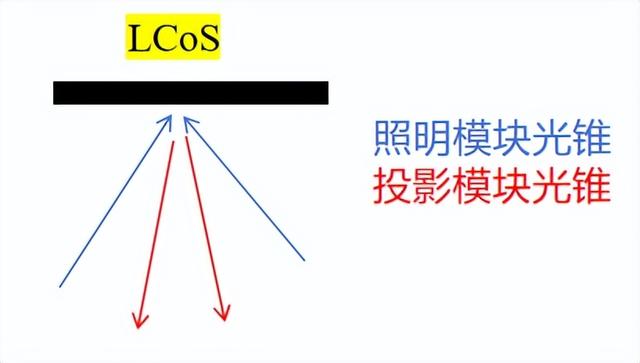 从后续投影镜头的设计来说,LCoS照明模块接收到的光展量大于或等于LCoS投影模块发出的光展量,确保投影模块所用到的光线锥内均有光线,如下所示,