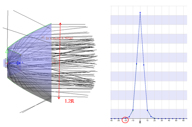 对于半球面内发光的LED光源来说,若需要收集其发出的所有角度光线,则只有使用TIR透镜,根据光展量守恒(光学系统第一个面发出的光展量等于系统最后一个面接收的光展量),若需要收光性能越好,则TIR透镜的半径越大,导致光学模组的体积越大,并且大角度光线如果耦合进波导之后,很有可能变成杂散光,干扰正常图像的显示,如下为TIR透镜半径对收光角度影响的对比: