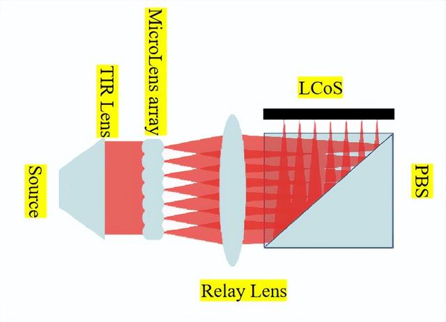 光源发出的光线需要经过TIR透镜(或者反光杯)收光,收集大角度光线的能量(提高能量利用率),然后经过微透镜阵列(积分透镜)的匀光,经过中继透镜到达PBS膜(透P反射S光),最后打到LCoS上,照亮LCoS,作为LCoS的照明显示源。除了使用TIR+微透镜阵列匀光的方式,一些方案采用匀光棒的方案进行匀光,可达到的均匀光较高,但是对横纵比要求,一般要求至少在匀光棒内发生3次TIR反射,导致其结构体积较大,所以多采用TIR透镜对光源发出光线准直的比较多。
