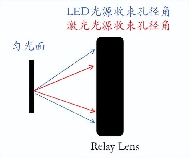 从中继透镜的设计来说,因为激光光源收束之后的角度小于LED光源,也就是说其孔径NA小于LED光源,导致其光线在中继透镜上的夹角较小,更加近似于近轴高斯光学,有利于后续中继透镜的设计,如下,
