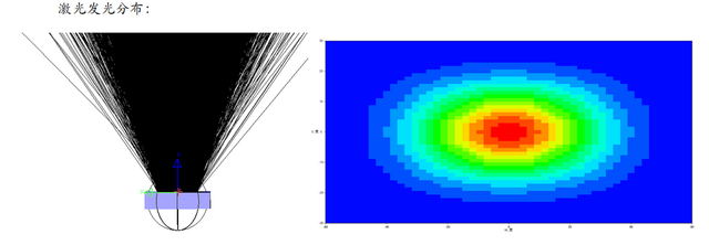 对于小角度发光的激光光源来说,则可以使用凸透镜对光线进行准直(无需使用180度收光的TIR透镜)。从数学角度上来看,激光光源的准直效果会比较好,因为激光光源发出的光线与准直透镜的夹角较小,近似为线性共轴光学,准直效果好,同时小角度带来的菲涅尔损耗也较小,能量利用率进一步提高。凸透镜小的收光半径可减小光学系统的体积和重量,如下,