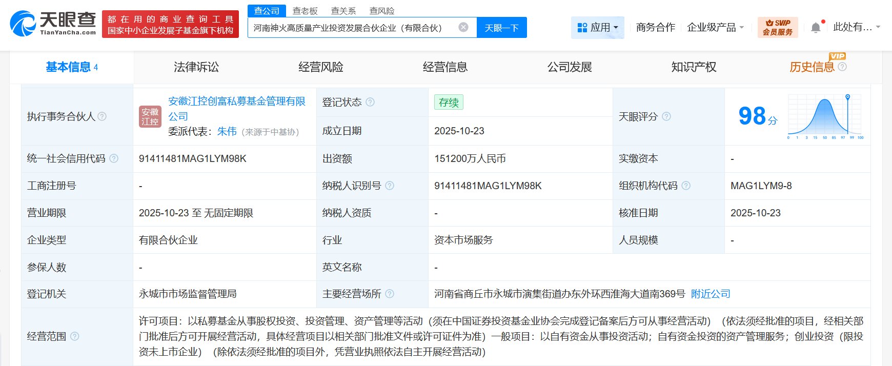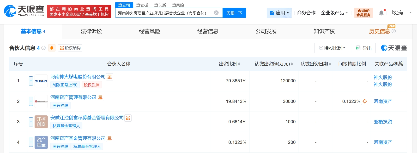 每经AI快讯,天眼查工商信息显示,近日,河南神火高质量产业投资发展合伙企业(有限合伙)成立,执行事务合伙人为安徽江控创富私募基金管理有限公司,出资额15.12亿元人民币,经营范围为以私募基金从事股权投资、投资管理、资产管理等活动,以自有资金从事投资活动,自有资金投资的资产管理服务,创业投资。合伙人信息显示,该企业由神火股份(000933)、河南资产管理有限公司、安徽江控创富私募基金管理有限公司、河南资产基金管理有限公司共同出资。
