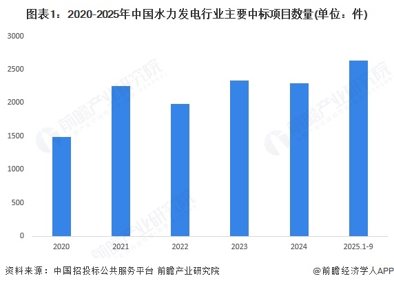 2020-2024年,中国水力发电行业中标项目数量整体呈现波动增长趋势,2024年中国水力发电行业中标项目数量达到2291件。2025年1-9月,中国水力发电行业中标项目数量为2640件。