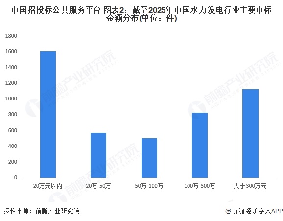 截至2025年8月,中国水力发电行业中标金额分布中,20万元以内主要是水力发电厂小设备的采购,该类型采购数量较高,数量超过1600件。整体来看,中国水力发电行业的中标项目金额偏小,主要是对农机配件的采购。