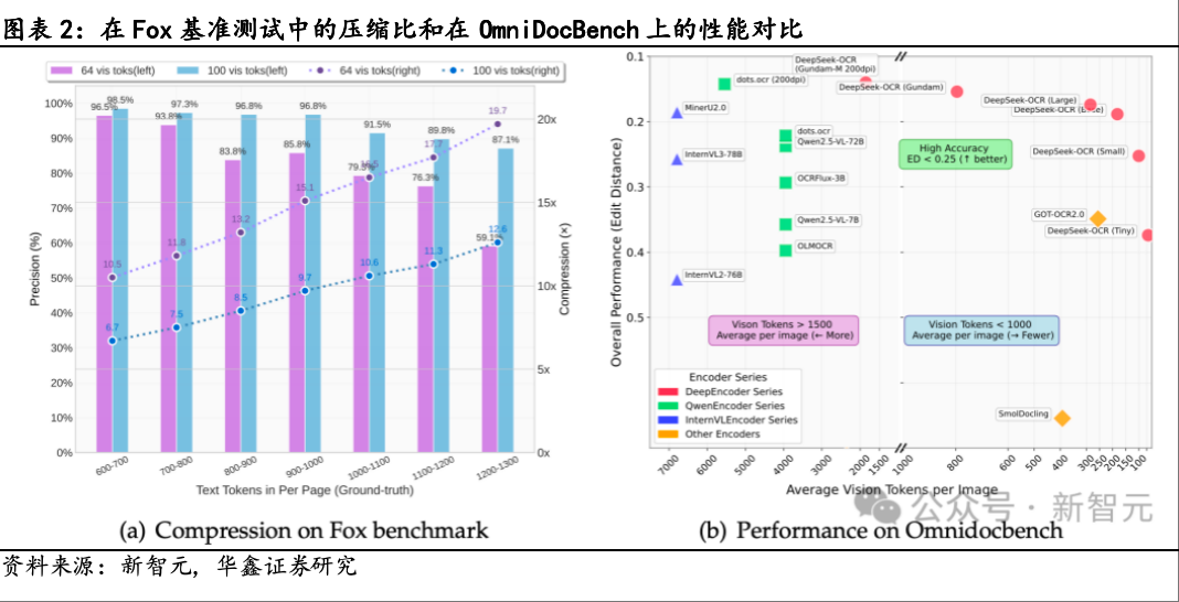 在OmniDocBench基准测试中,DeepSeek-OCR仅使用100个视觉token便超越了GOT-OCR2.0(每页256个token);以少于800个视觉token的表现,胜过了MinerU2.0(平均每页6000多个token)。在Fox基准测试中,在10倍压缩比内,DeepSeek-OCR解码精度可达约97%;即使压缩比接近20倍,精度仍能维持在60%左右,验证了“上下文光学压缩”的强大潜力。