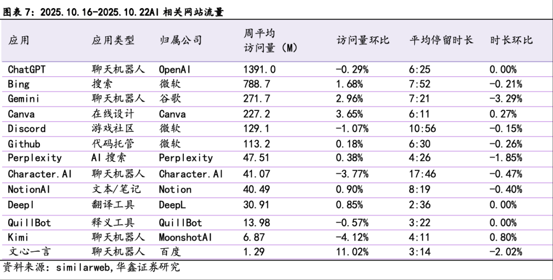 本期(2025.10.16-2025.10.22)AI相关网站流量数据:访问量前三位分别为ChatGPT(1391.0M)、Bing(788.7M)和Gemini(271.7M),访问量环比增速第一为文心一言(11.02%);平均停留时长前三位分别为Character.AI(00:17:46)、Discord(00:10:56)和NotionAI(00:08:19);平均停留时长环比增速第一为Kimi(0.80%)。