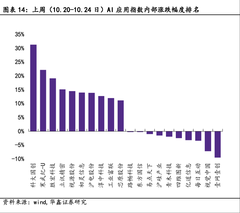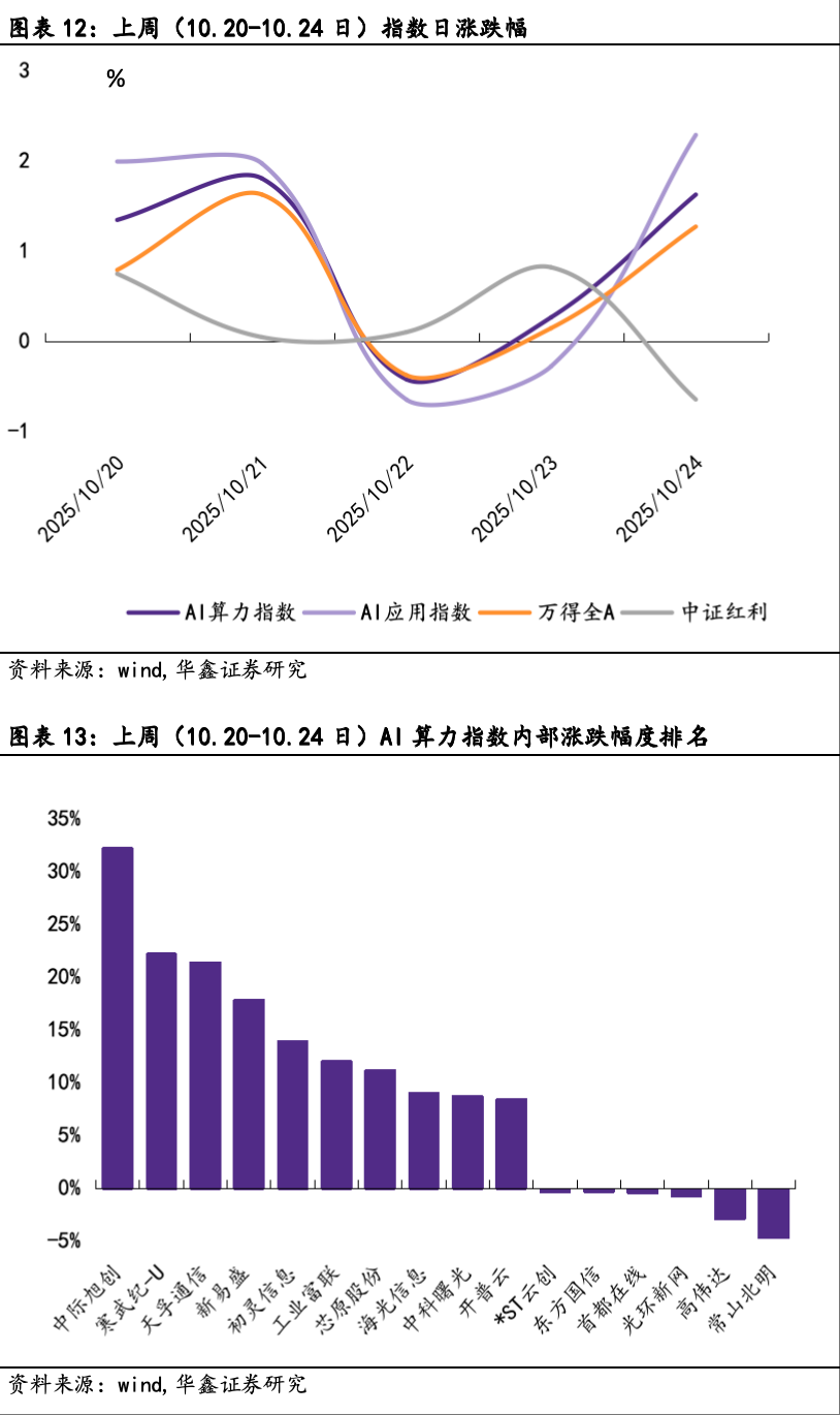上周(10.20-10.24日),AI算力指数/AI应用指数/万得全A/中证红利日涨幅最大值分别为1.80%/2.28%/1.62%/0.81%,AI算力指数/AI应用指数/万得全A/中证红利日跌幅最大值分别为-0.42%/-0.65%/-0.38%/-0.65%。AI算力指数内部,中际旭创以+32.23%录得上周最大涨幅,常山北明以-4.67%录得上周最大跌幅。AI应用指数内部,科大国创以+31.31%录得上周最大涨幅,壹网壹创以-9.48%录得上周最大跌幅。