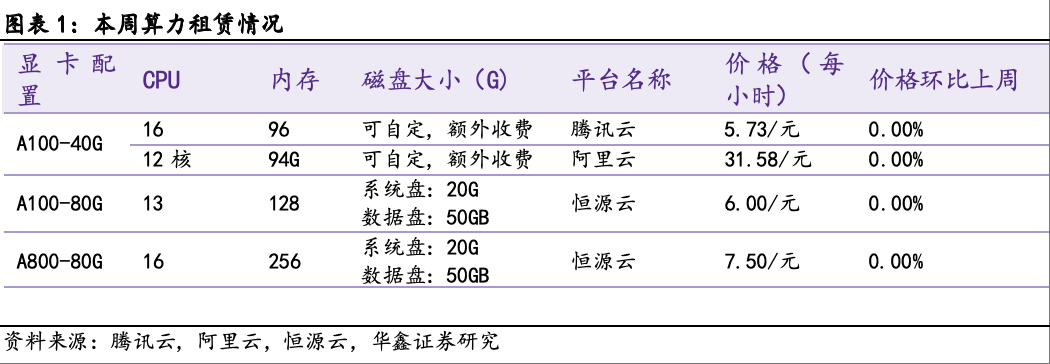 本周算力租赁价格平稳。具体来看,显卡配置为A100-40G中,腾讯云16核+96G价格为5.73元/时,阿里云12核+94GiB价格为31.58元/时;显卡配置为A100-80G中,恒源云13核+128G价格为6.00元/时;显卡配置为A800-80G中,恒源云16+256G价格为7.50元/时。