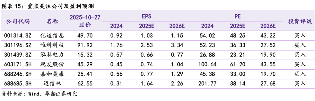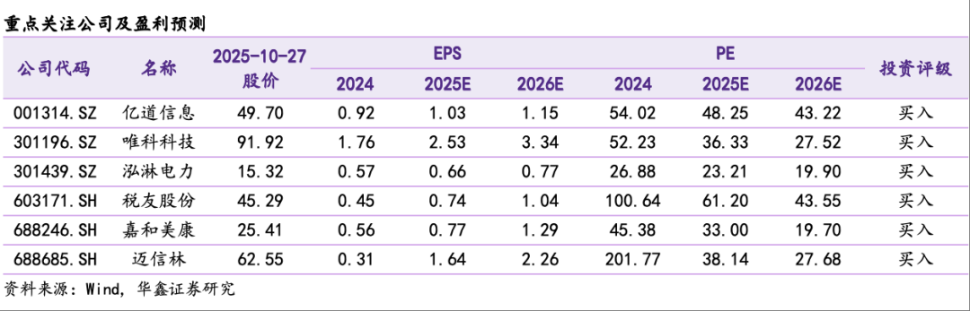 中长期,建议关注临床AI产品成功落地验证的嘉和美康(688246.SH)、已与Rokid等多家知名AI眼镜厂商建立紧密合作的亿道信息(001314.SZ)、加快扩张算力业务的精密零部件龙头迈信林(688685.SH)、持续加码高速铜缆的泓淋电力(301439.SZ)、新能源业务高增并供货科尔摩根等全球电机巨头的唯科科技(301196.SZ)等。