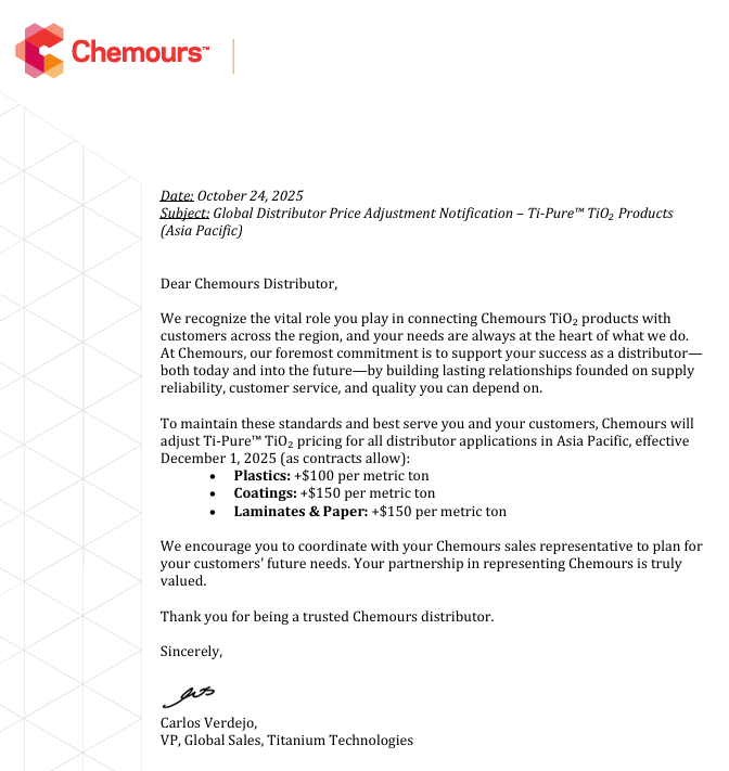 10月24日科慕宣布,自2025年12月1日起,将上调亚太地区所有经销的各应用领域钛白粉产品价格。塑料领域钛白粉上调100美元/吨;涂料领域钛白粉上调150美元/吨;层压板和造纸领域钛白粉上调150美元/吨。