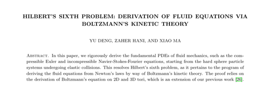 该问题是David Hilbert在1900年提出的23个数学难题之一,其中比较广为人知的包括黎曼猜想、哥德巴赫猜想等,第六题则要求学者从牛顿力学出发,通过玻尔兹曼动力学理论,推导出流体力学中的基本方程。