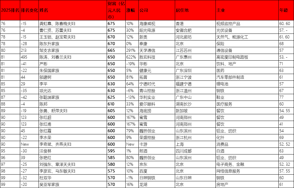 10月28日,《2025衡昌烧坊·胡润百富榜》正式发布。榜单显示,龚虹嘉、陈春梅夫妇以675亿元的身家位列第76位。与去年相比,他们的财富增长了60亿元,增幅达10%,但排名下降了15位。
