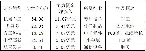 从主力资金来看,今日涨停板个股中,主力资金净流入金额排名前5的个股分别为长城军工、多氟多、方正科技、中钨高新、航天发展。