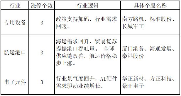 从行业特征来看,今日涨停板个股中,专用设备、航运港口、电子元件行业的个股最多。
