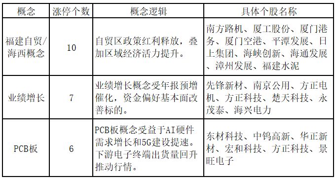 从概念特征来看,今日涨停板个股中,福建自贸/海西概念、业绩增长、PCB板概念的个股最多。