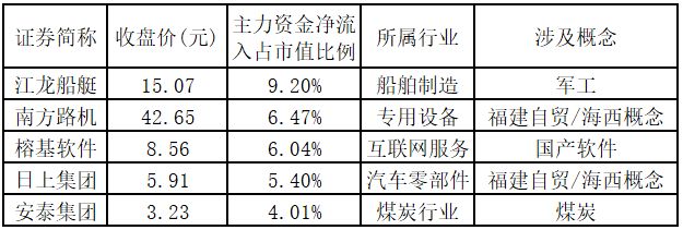 主力资金净流入金额占市值比例排名前5的个股分别为江龙船艇、南方路机、榕基软件、日上集团、安泰集团。欢迎大家关注微信公众号“道达号”,其“道达涨停复盘”栏目为大家解读。