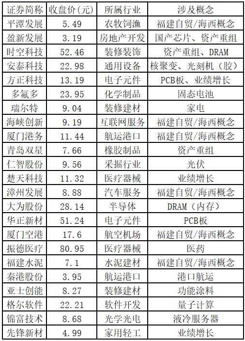 涨停板个股中,股价创出近一年新高的个股有23只(不包括创出历史新高的个股),包括平潭发展、盈新发展、时空科技、安泰科技、方正科技、多氟多、瑞尔特、海峡创新、厦门港务、青岛双星、仁智股份、楚天科技、漳州发展、大为股份、华正新材、厦门空港、振德医疗、福建水泥、秦港股份、亚士创能、格尔软件、锦富技术、先锋新材,具体如下表所示。