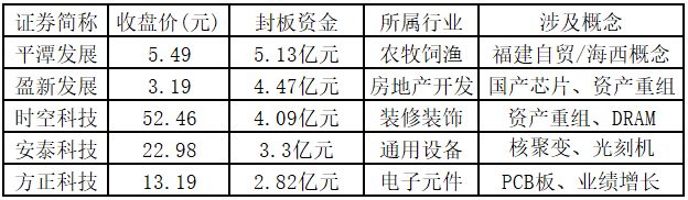从封板资金来看,今日涨停板个股中,封板资金排名前5的个股包括平潭发展、盈新发展、时空科技、安泰科技、方正科技。