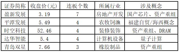 从连板情况来看,今日首板个股有45只;2连板的个股有6只;3连板及以上的个股有7只。今日连板数排名前5的个股包括盈新发展、平潭发展、时空科技、达华智能、青岛双星,具体如下表所示。
