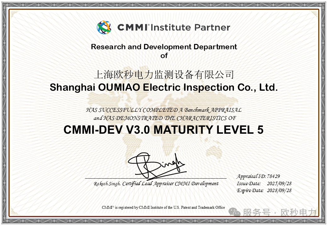 近日,上海欧秒电力监测设备有限公司传来重磅喜讯 —— 其研发体系成功通过 CMMI Institute(美国能力成熟度模型集成研究所)基准评估,正式通过CMMI-DEV V3.0 成熟度 5 级认证(评估 ID:78429),证书有效期至 2028 年 9 月 28 日。这标志着欧秒在研发过程改进、质量管理及项目交付能力上达到全球软件与系统工程领域的最高成熟度水平,成为国内电力监测设备行业少数获此殊荣的企业之一。
