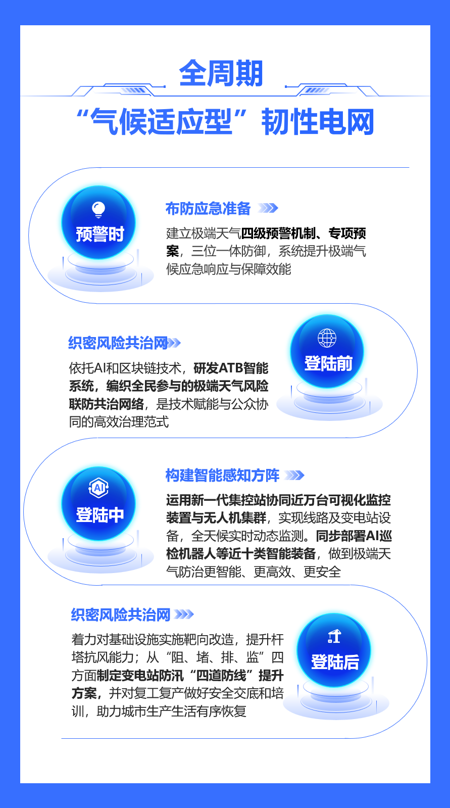 随着全球气候变暖的加剧,台风、暴雨、高温之类的极端天气事件愈发频繁。近两年来,上海市共出现十多次极端天气事件,其中超强台风4次。尤其是2024年,新中国成立以来最强台风、龙卷风、“暴力梅”等气候事件频发,给上海的公共安全和治理带来了前所未有的挑战。超高压电网,是城市可靠供电“大动脉”,构建一个能够抵御极端天气影响的“气候适应型”韧性电网,迫在眉睫。国网上海超高压公司通过机制创新、区块链共治、智能感知及设备韧性升级等举措,全面构建覆盖灾害全周期的“气候适应型”韧性电网建设体系。