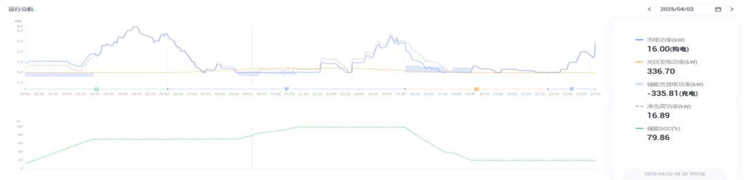 图片说明:2025年4月2日运行分析曲线,清晰呈现不同时段运行策略:夜间谷段,固定功率充电至SOC 70%;白天平段,负荷需求较小时,将光伏无法消纳的余电充入储能,补能至SOC 100%,减少弃电量;傍晚峰段,光伏出力下降,储能动态向负载供电,放电至SOC 10%,保障套利收益最大化。
