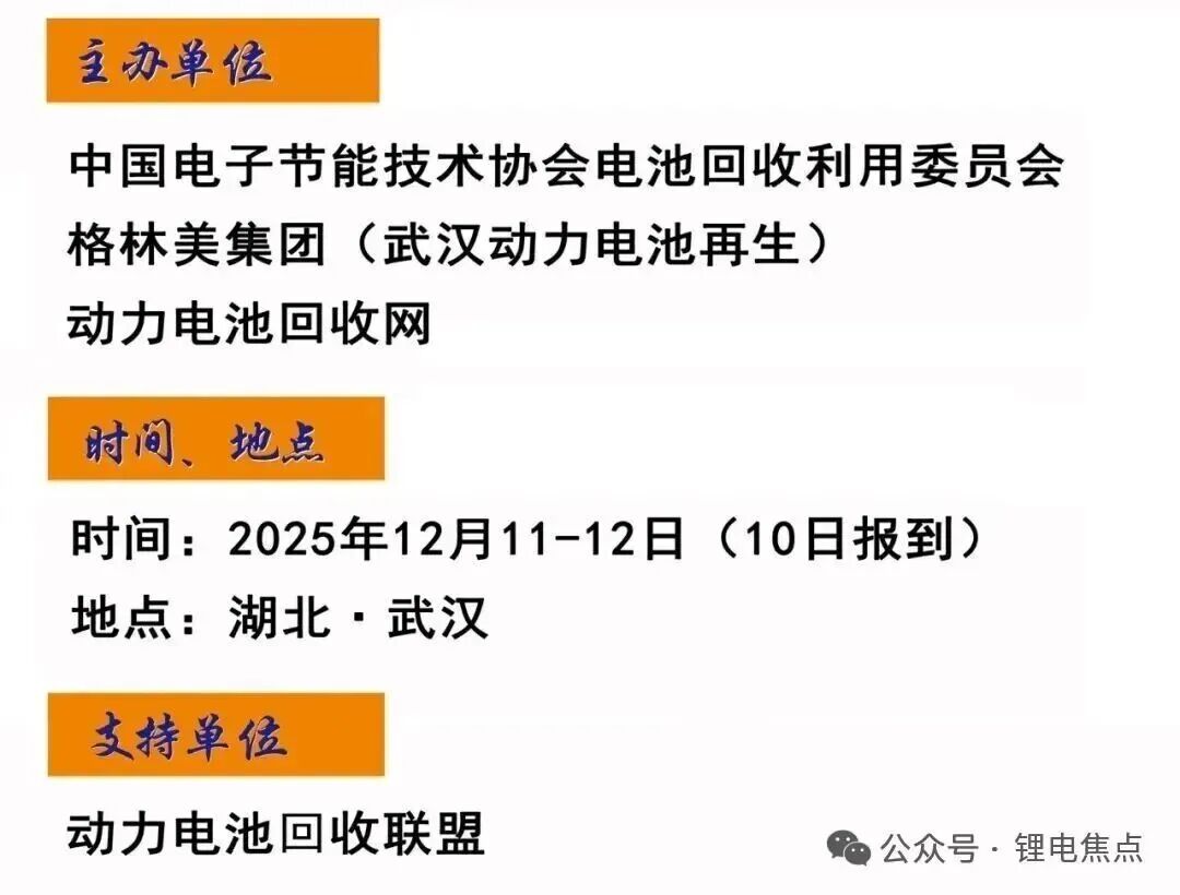 动力电池回收网消息,“2025中国动力电池回收利用行业回收年会暨新型、高效提锂技术发展论坛”将于12月11-12日在武汉举办,规模:500+,大会主题:绿色循环·高效提锂。
