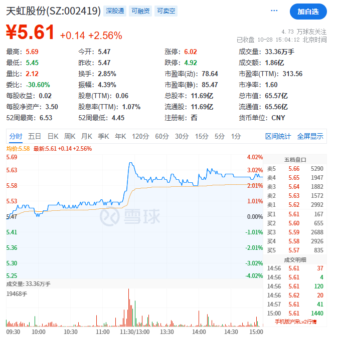 二级市场上,截至10月28日收盘,天虹股份涨2.56%,报5.61元/股,总市值65.57元。