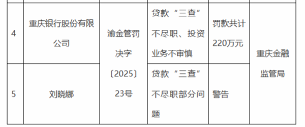 根据国家金融监督管理总局重庆监管局10月下旬披露的行政处罚信息,重庆银行股份有限公司因贷款“三查”不尽职、投资业务不审慎的违规行为,被处以罚款共计220万元。