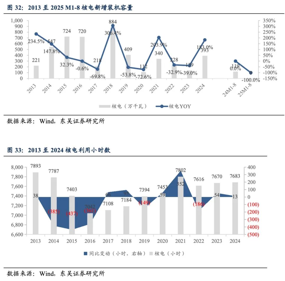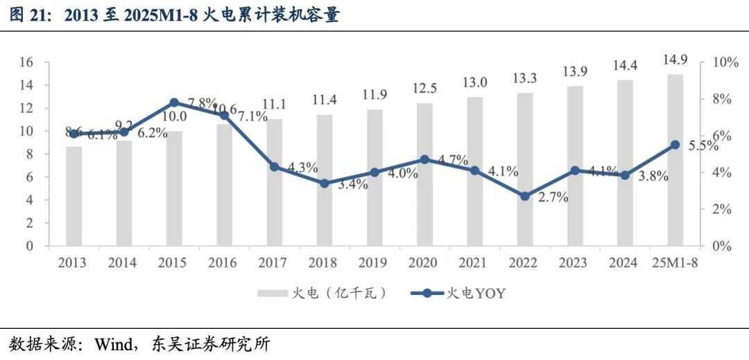 装机容量与利用小时数:截至2025年8月31日,中国火电累计装机容量达到14.9亿千瓦,同比提升5.5%。2025年1至8月,中国火电新增装机容量4987万千瓦,同比增长74.4%。2024年1至12月,中国火电利用小时数4400小时,同比下降76小时。