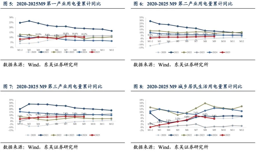 全社会用电量:2025M1-9全社会用电量7.77万亿千瓦时(同比+4.6%),同比增速较2025M1-8同比增速4.6%持平,其中,第一产业、第二产业、第三产业、居民城乡用电分别同比+10.2%、+3.4%、+7.5%、+5.6%。2025年用电量增速稳定。