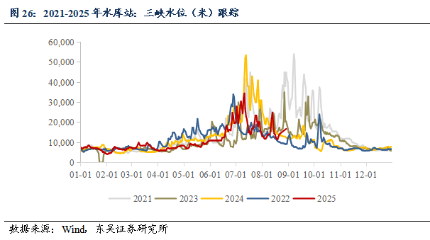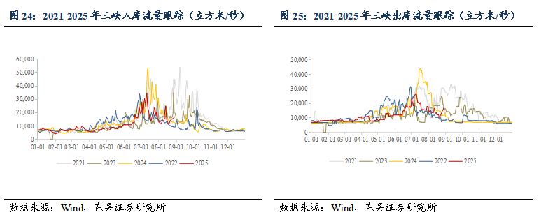 水情跟踪:2025年10月24日,三峡水库站水位175米,2021、2022、2023、2024年同期水位分别为173米、159米、174米、167米,蓄水水位正常。2025年10月24日,三峡水库站入库流量16500立方米/秒,同比增加92%,三峡水库站出库流量11900立方米/秒,同比增加70%。
