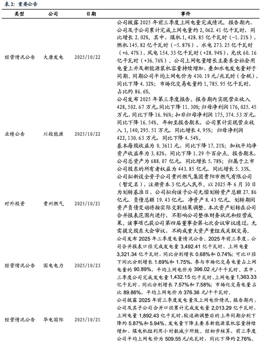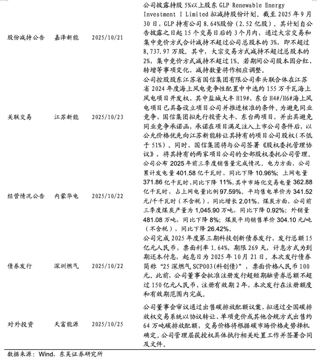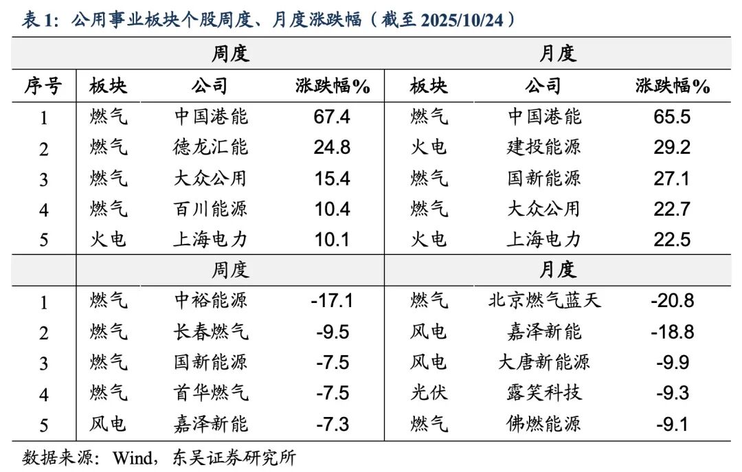 个股涨跌幅:个股涨跌幅:本周(2025/10/20–2025/10/24),涨幅前五的标的为:中国港能(+67.4%)、德龙汇能(+24.8%)、大众公用(+15.4%)、百川能源(+10.4%)、上海电力(+10.1%)。跌幅前五的标的为:中裕能源(-17.1%)、长春燃气(-9.5%)、国新能源(-7.5%)、首华燃气(-7.5%)、嘉泽新能(-7.3%)。