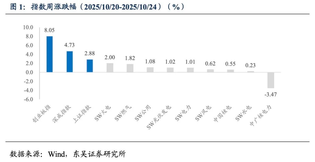 板块周行情:本周(2025/10/20-2025/10/24),SW公用指数上涨1.08% ,从细分板块来看,SW火电(2.00%)、SW燃气(1.82%)、SW光伏发电(1.02%)、SW风电(0.62%)、中国核电(0.55%)、SW水电(0.23%)。