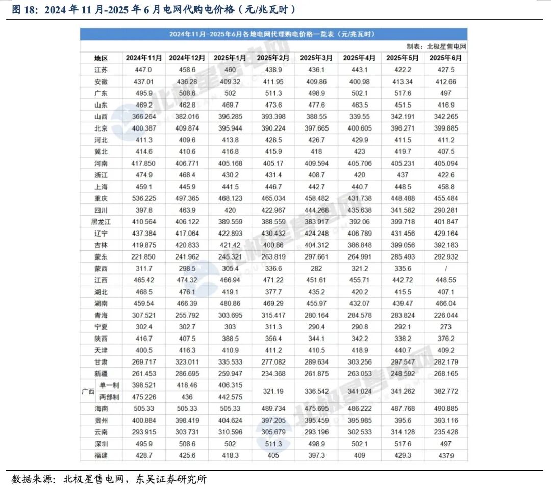电网代购电价:2025年6月各省均价(算术平均数)389元/MWh,同比下降1%,环比-1.3%。