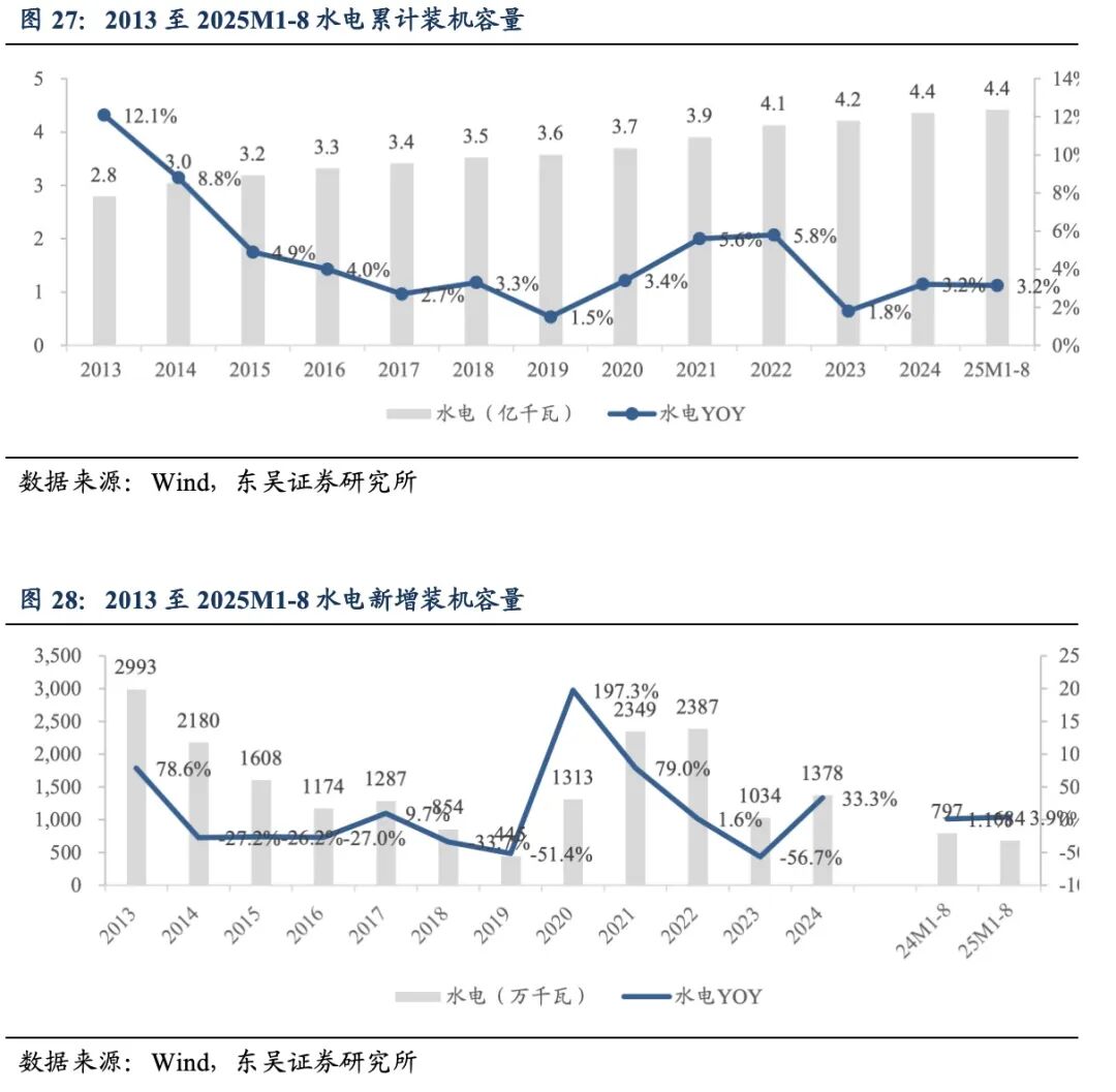 装机容量与利用小时数:截至8月31日,中国水电累计装机容量达到4.4亿千瓦,同比提升3.2%。2025年1至8月,中国水电新增装机容量684万千瓦,同比+3.9%。2024年1至12月,中国水电利用小时数3349小时,同比提升219小时。
