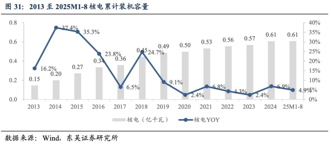 装机容量与利用小时数:截至2025年8月31日,中国核电累计装机容量达到0.61亿千瓦,同比提升4.9%。2025年1至8月,中国核电新增装机容量0万千瓦。2024年1至12月,中国核电利用小时数7683小时,同比上升13小时。