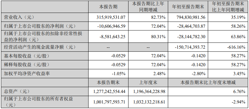 归属于上市公司股东的净亏损为2846.47万元。归属于上市公司股东的扣除非经常性损益的净亏损为2814.48万元。基本每股亏损为0.142元。