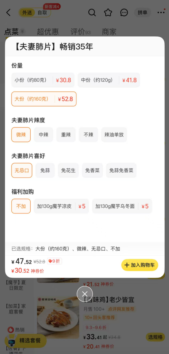 10月27日,雷达财经通过某外卖平台了解到,在紫燕的一家线上外卖店中,一份160克的夫妻肺片原价为52.8元,按此计算,其每斤价格再次上涨,达到165元。
