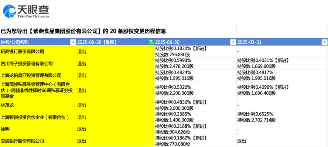 据天眼查股权变更历程信息,第三季度,紫燕食品身后的多家股东选择退出,包括招商银行股份有限公司、四川海子投资管理有限公司、上海龙柏鑫亚投资管理有限公司等。