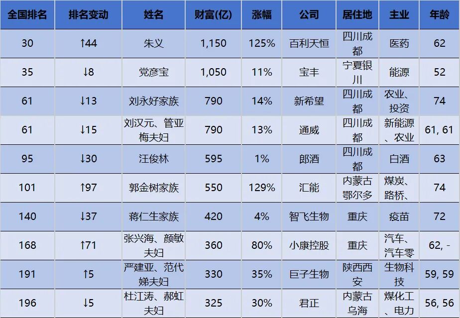 西部NO.1:朱义,财富1150亿元,涨幅125%,居住地四川成都,公司为百利天恒,今年排名第30位,去年排名第74位,上升44位。