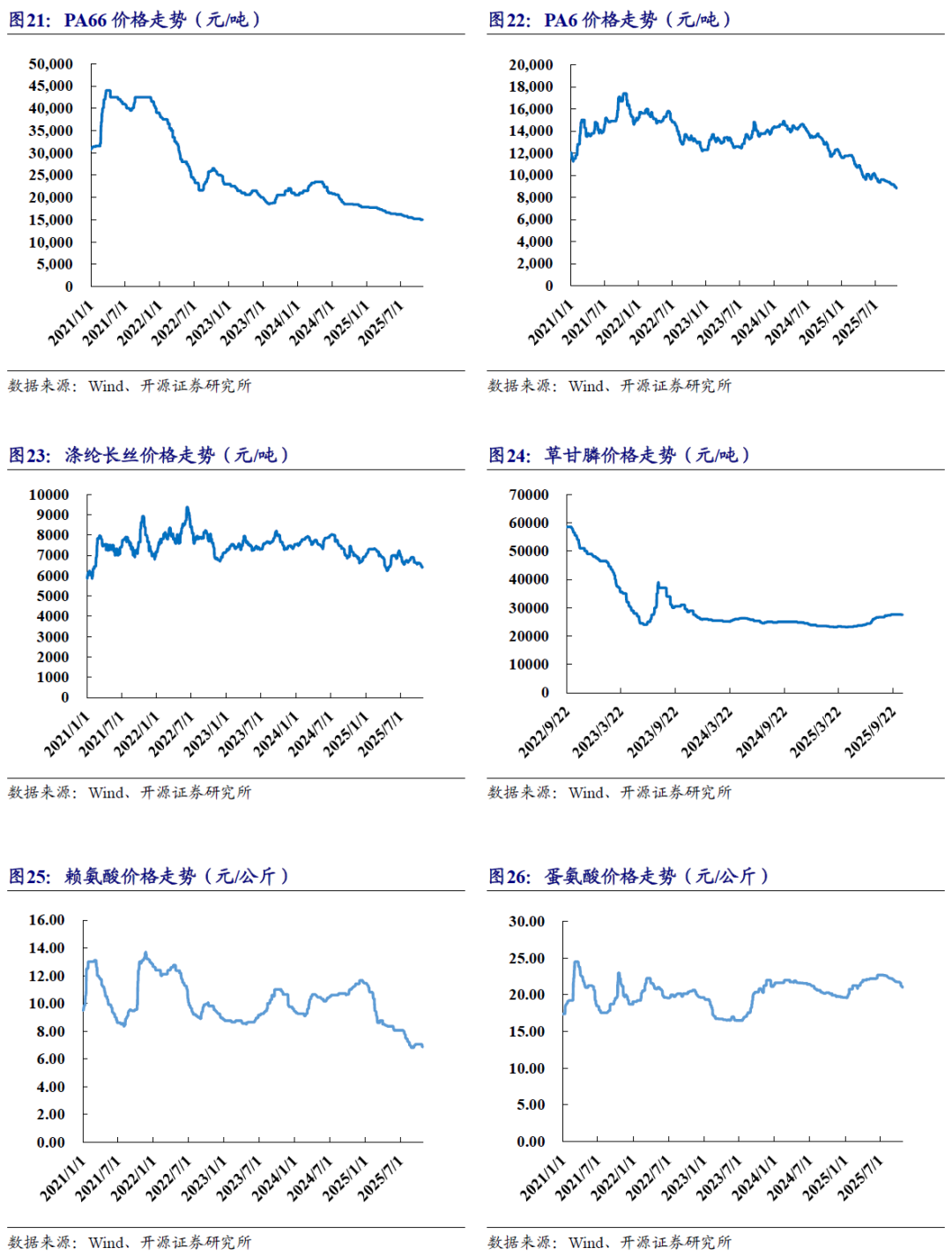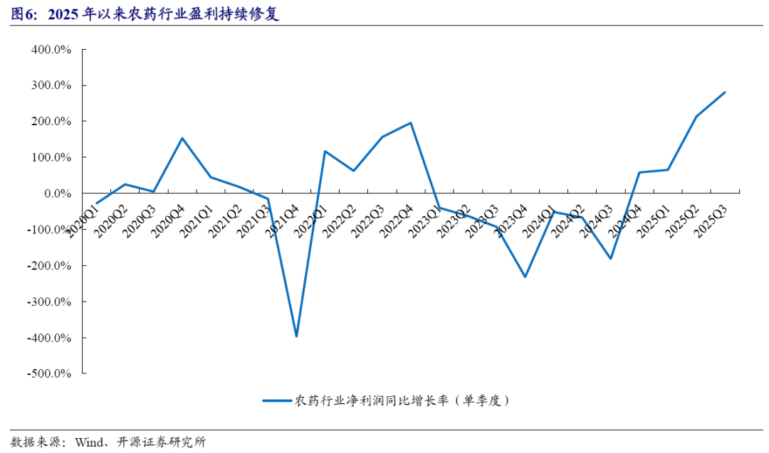 海外农药巨头库存水平持续回落至历史正常水平,截至2025年上半年末,安道麦公司存货116.1亿元,已恢复至2021年水平;富美实存货金额为14亿美元,相比2023年的历史高点,去库存效果显著。随着国际农化巨头的库存恢复至历史正常水平,标志着此轮农药行业去库存也基本接近尾声,市场采购逐步正常化。随着市场需求恢复正常,农药板块盈利也快速修复;自2024年四季度开始,农药行业净利润同比增长率迅速转正,近四个季度分别为58%、65%、213%、281%,行业盈利修复进程不断加快。