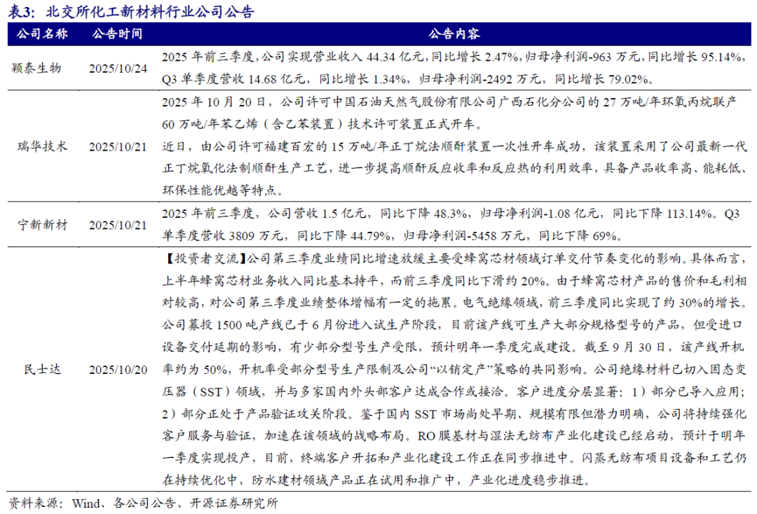 颖泰生物2025年前三季度归母净利润同比+95.14%;2025年前三季度,公司实现营业收入44.34亿元,同比增长2.47%,归母净利润-963万元,同比增长95.14%,Q3单季度营收14.68亿元,同比增长1.34%,归母净利润-2492万元,同比增长79.02%。宁新新材2025年前三季度业绩同比出现下滑;2025年前三季度,公司营收1.5亿元,同比下降48.3%,归母净利润-1.08亿元,同比下降113.14%。Q3单季度营收3809万元,同比下降44.79%,归母净利润-5458万元,同比下降69%。