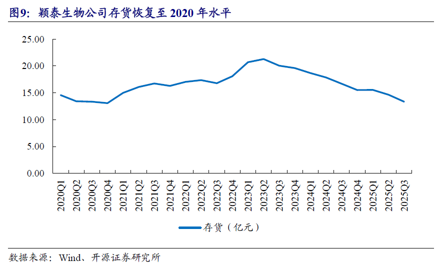 自2023年以来,公司存货水平持续下降,截至2025年三季度末,颖泰生物公司存货为13.35亿元,恢复至2020年水平,去库存效果显著。