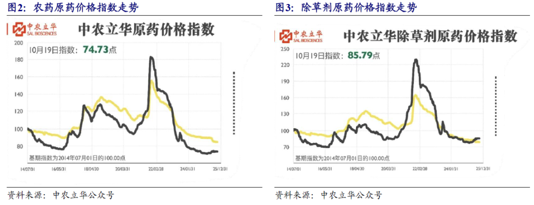 2025年上半年,农药市场总体仍然处于供大于求的局面,行业竞争激烈,但农药库存逐步回归正常水平,部分产品价格出现回暖迹象,给行业发展带来了一定积极影响;烯草酮、百菌清、毒死蜱、阿维菌素、甲氨基阿维菌素苯甲酸盐等十几个品种出现不同程度的涨价。整体来看国内农药价格目前仍处于历史低点,但部分品种已经出现止跌回升迹象。截至2025年10月19日,中农立华原药价格指数报74.73点,同比下跌0.07点,跌幅0.09%;除草剂原药价格指数报85.79点,同比上涨3.42%。