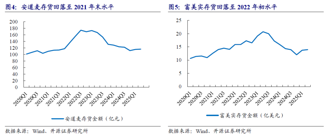 海外农药巨头库存水平持续回落至历史正常水平,截至2025年上半年末,安道麦公司存货116.1亿元,已恢复至2021年末水平;富美实存货金额为14亿美元,相比2023年的历史高点,去库存效果显著。随着国际农化巨头的库存恢复至历史正常水平,标志着此轮农药行业去库存也基本接近尾声,市场采购逐步正常化。