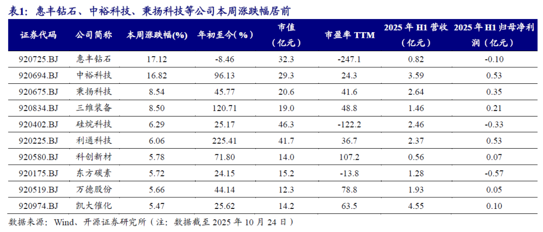 本周北交所化工新材行业涨跌幅居前的个股分别为惠丰钻石(+17.12%)、中裕科技(+16.82%)、秉扬科技(+8.54%)、三维装备(+8.50%)、硅烷科技(+6.29%)、利通科技(+6.06%)。